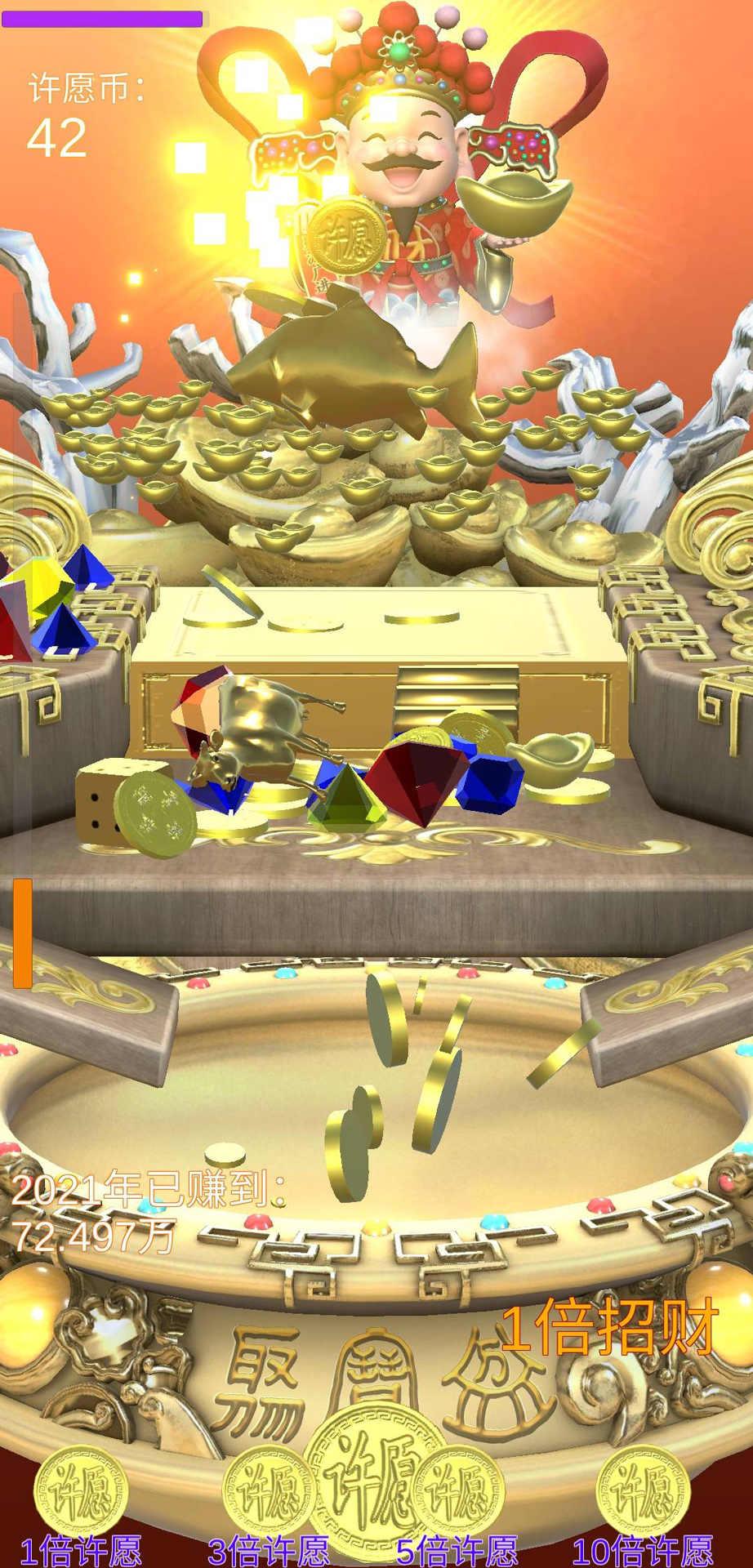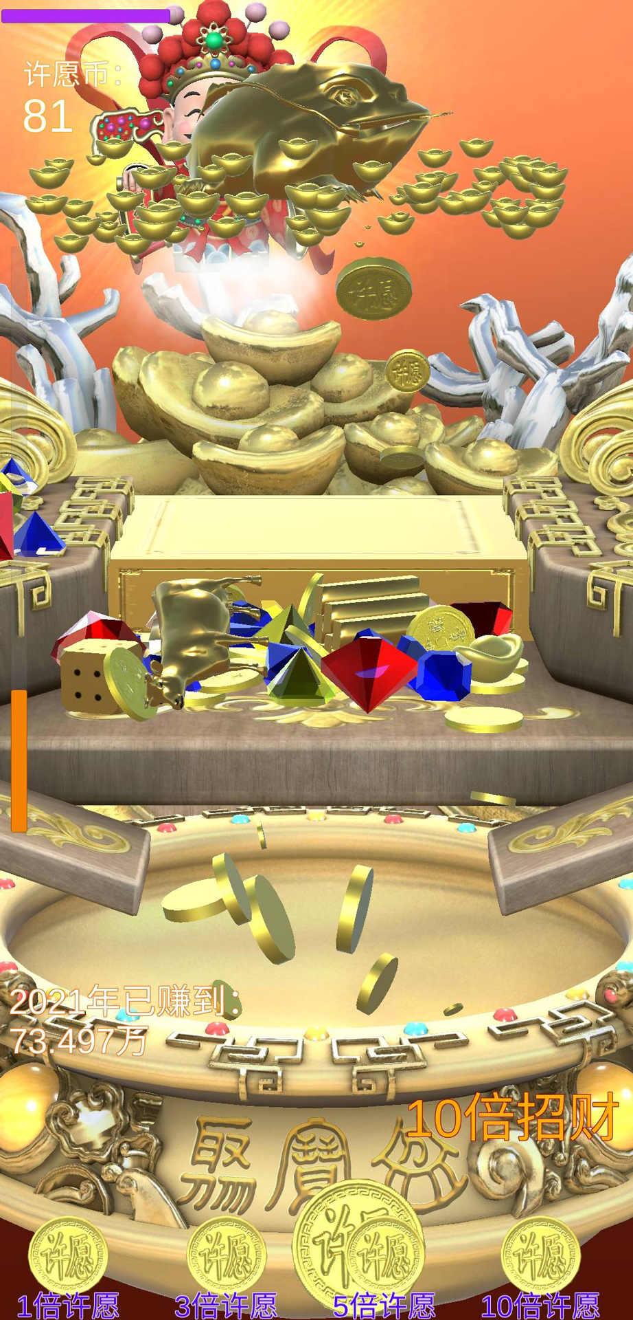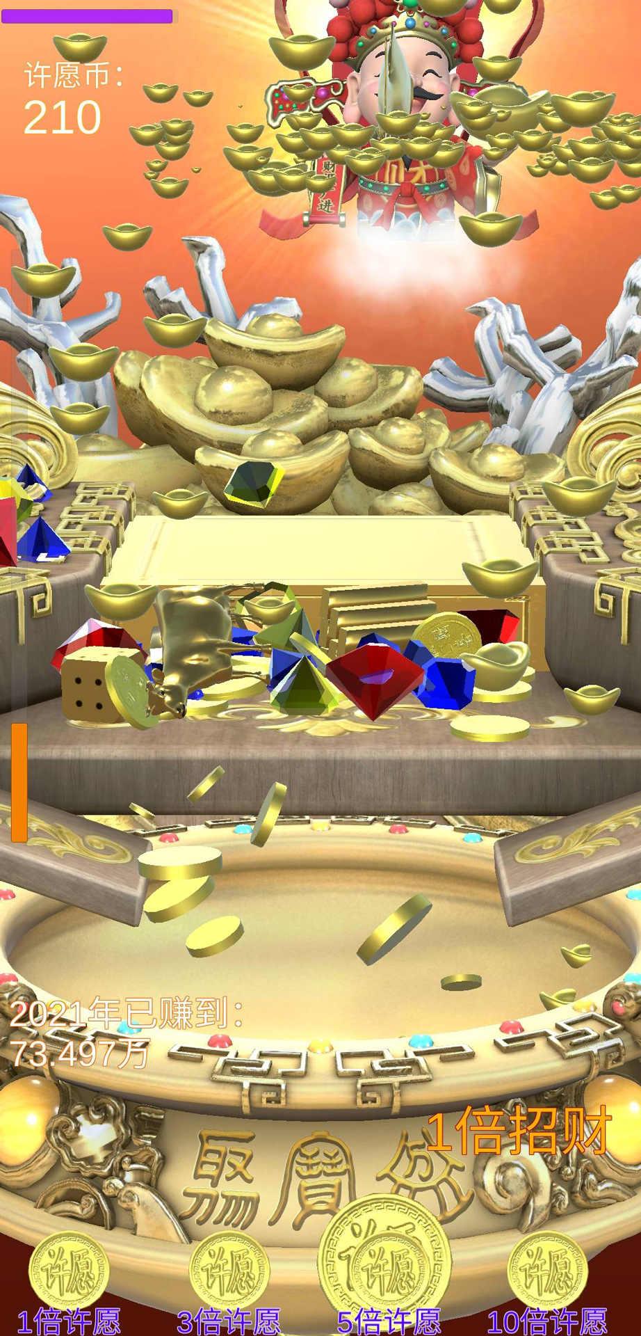 财神到招财进宝破解版是修改了游戏的广告属性,玩家能够不看广告直接获得奖励还是非常方便实用的,在这款游戏中玩家能够通过简单地许愿来获取财神的祝福来获得大量的元宝,看看你能够通过许愿获得多少的元宝,来测一下你的今年的运势吧。