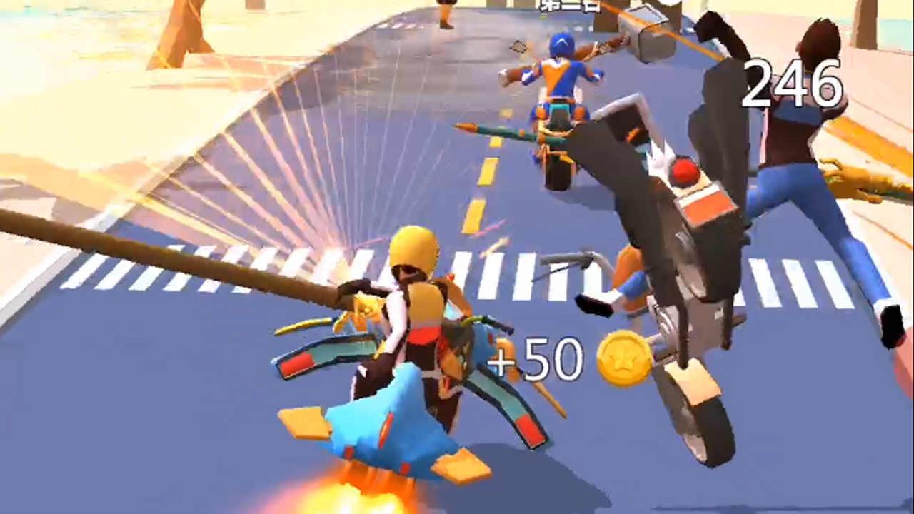 3、用你的拳击还有脚攻击其他的摩托选手,用尽各种办法来阻止对方的加速和冲击。