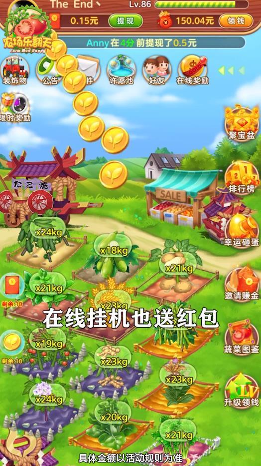 农场乐翻天中你将进行一家农场的模拟经营,在这里你可以自由进行多样蔬菜的种植,玩法非常多样且富有趣味,你只需要浇浇水就可以进行农作物的种植操作,轻松就可以进行多样农作物的收获,成熟的农作物是可以出售的。