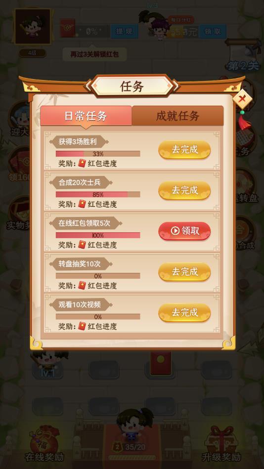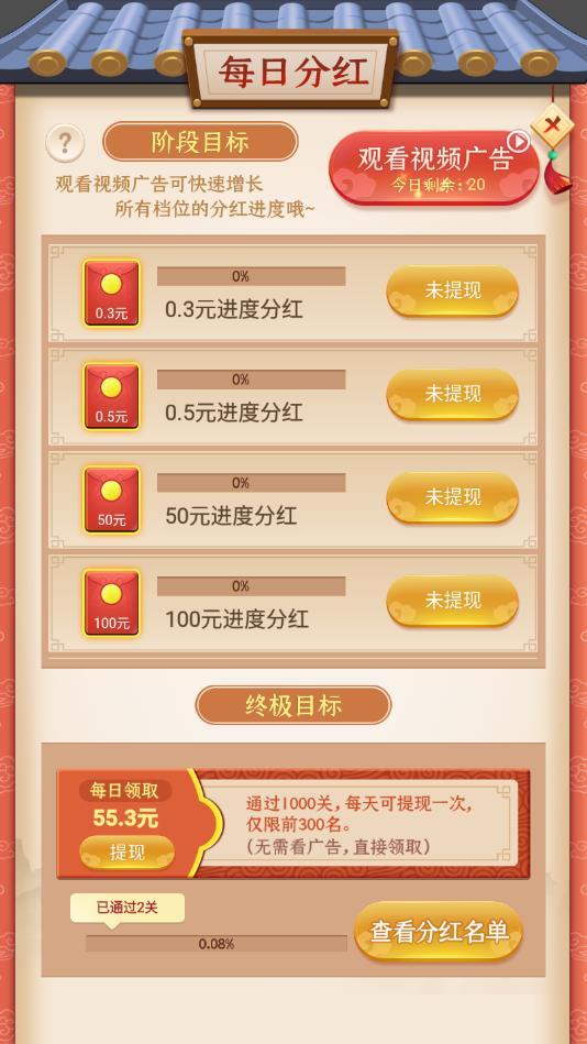在这里闯关就可以获得红包奖励,还可以以看广告的方式进行分红红包的获取,多样的游戏任务,完成任务也可以进行红包奖励的领取。