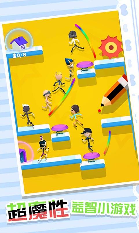 3、火柴人快溜帮助这些火柴人从绝境中溜出去。只需要滑动屏幕就能画出线了,当然这个道路要尽量平稳安全。