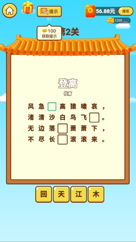 诗词钱多多是以诗词为题材的答题闯关游戏,玩法是非常有趣的,点击即可进行诗词中其实地方的填字,海量的诗词题目,让你可以尽情沉浸在诗词的海洋中,进行知识的温故,还可以进行新诗词的学习,闯关成功就可以获得红包奖励。