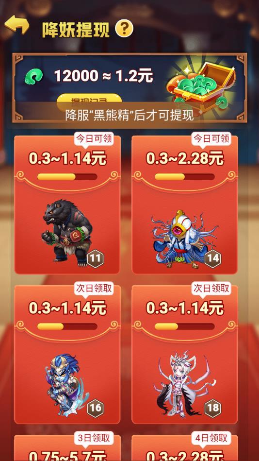 不断进行多样英雄妖怪的收服,就可以进行降妖伏魔了,以合成的方式进行更多等级妖怪的解锁,还可以获得更多的红包奖励。
