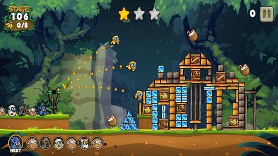 1、射杀猴子破坏建筑,能够通过拖动将猴子射到所需位置收集更多的香蕉获得分数;