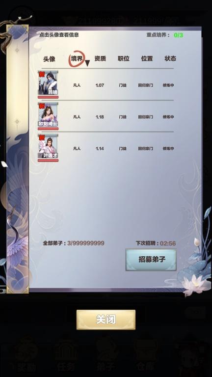 游戏中你是做为一个宗门的宗主招收徒弟壮大实力,并且培养徒弟修道飞仙!