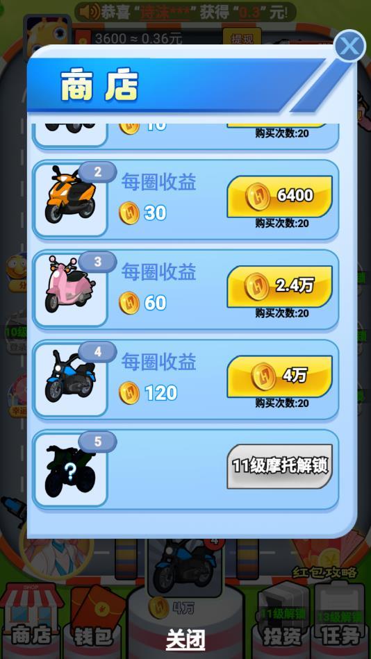不断解锁更多等级的赛车,轻松就可以进行跑圈,越高等级的赛车,跑圈获得的金币也就越多,金币可以用来购买更多的赛车,解锁新等级赛车就有红包奖励。