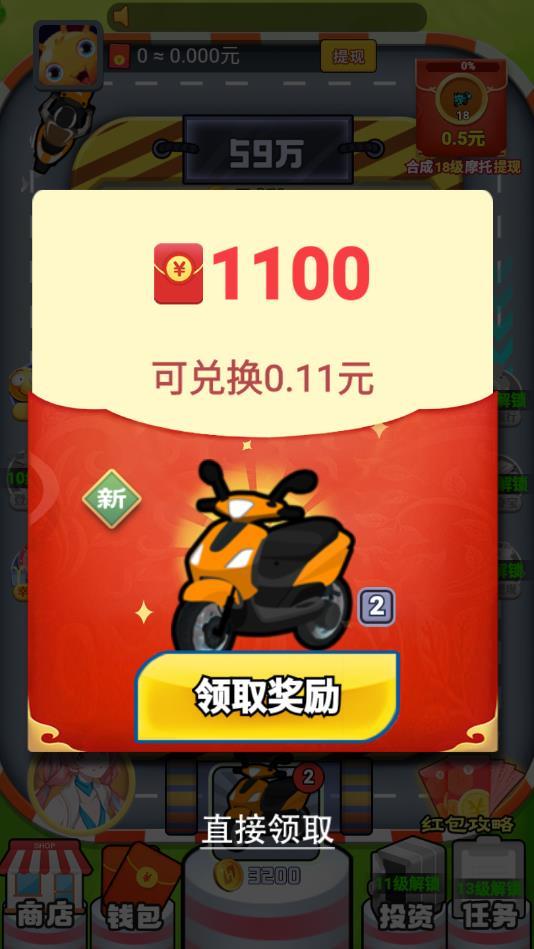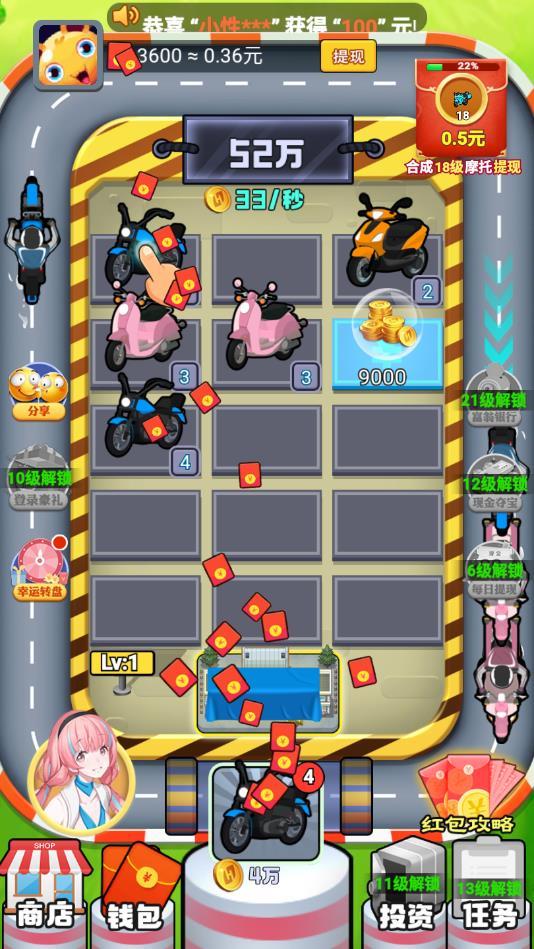 飚速摩托车是以摩托车为题材的非常有趣的赛车类经营游戏,以合成的方式解锁等级更高更加厉害的赛车,不同等级的赛车跑圈,可以获得不同的金币,每解锁一个等级的赛车,就可以获得红包奖励,点击即可领取,支持进行提现操作。