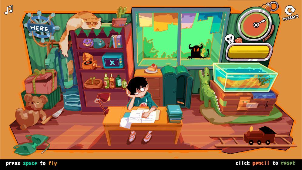 玩法就是按空格让笔到处飞,笔可能会掉落在房间的某个角落里;