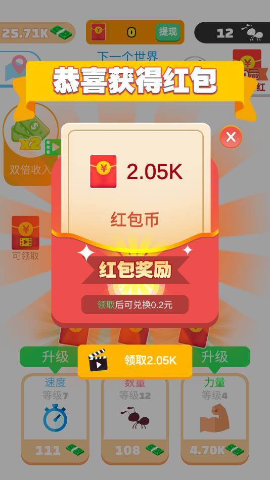 玩法是非常简单的,点击即可进行数量、力量等方面的升级操作,让你的蚂蚁军团搬运食物,越来越迅速,而且还可以领取红包奖励。