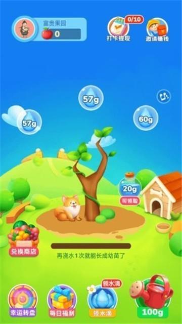 富贵果园轻松就可以进行不同果树的种植,线上种树是非常简单的事,点击即可进行小树的种植,只需要定时浇浇水,小树就可以不断长大,进行果子的收获,还能够进行赚取,轻松就可以及西宁收益的领取,得到一定额度,点击就可以提现。