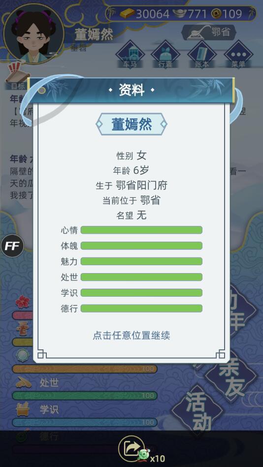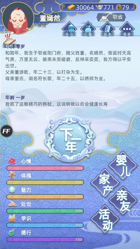 您是否想要尝试经历古代的生活,在古代人生这款游戏中,玩家将随机成为一位古代的人物,您在这里面想要成为什么样的人,走上什么样的道路都是可以的,此版本中内置了菜单,开启后有无限的资源,铜钱金条和玉佩等都用不完,还能够属性满级,玩起来非常的轻松;