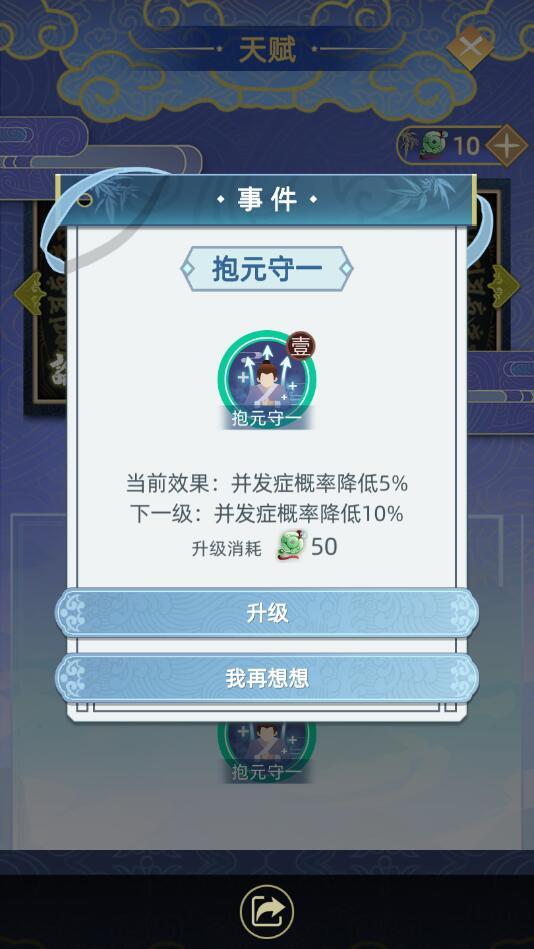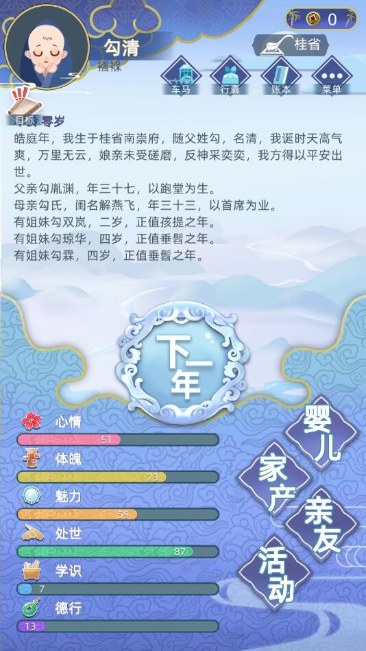 古代人生(货币不减反增)是一款很火的经营模拟游戏,玩家在游戏中将扮演一名古代的人,您需要从婴儿时期开始成长,游戏有很高的自由度,不同的选择会决定着您的属性,各种事件随机出现,您想成为什么样的人由您来决定,此版本中免广告可以获取资源,而且在杂市购买物品时货币会不减反增;