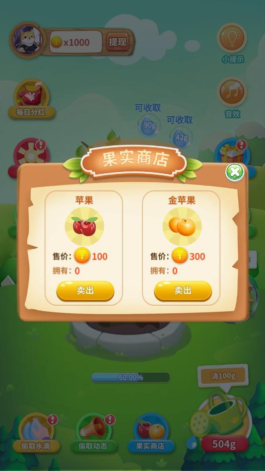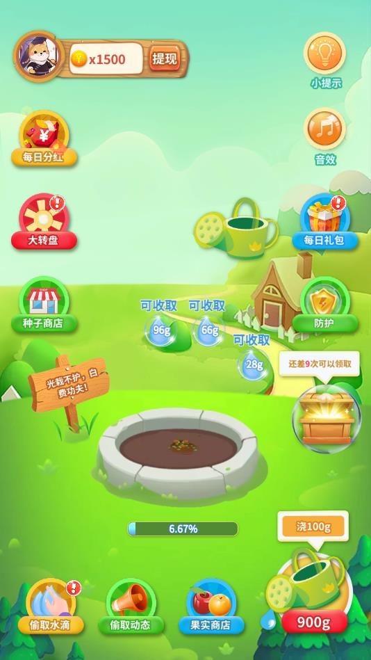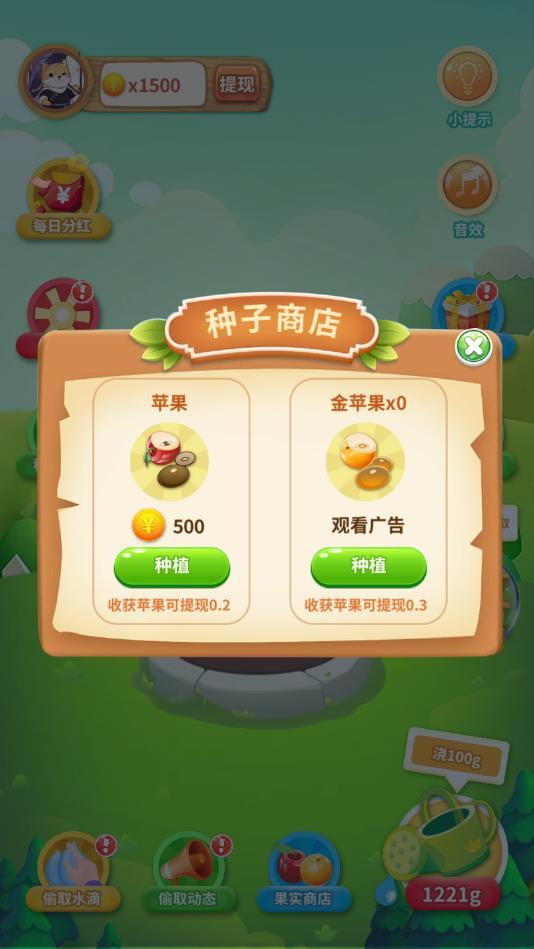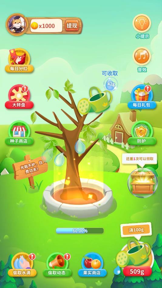 自由进行不同的种子,点击即可进行种子的种植,定期浇水,能够让小树能够更加快速的长大,不同类型的果实可以获取不同的金币收益,金币是可以进行提现的。