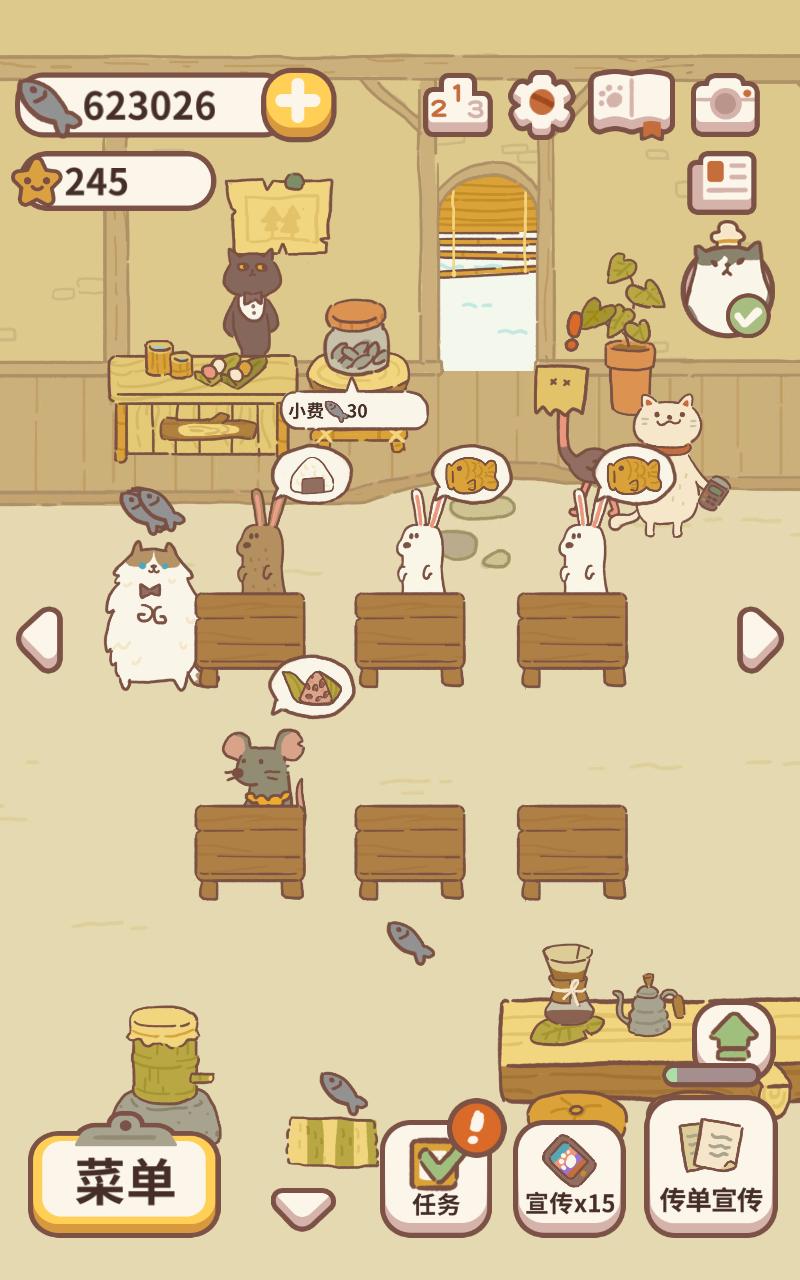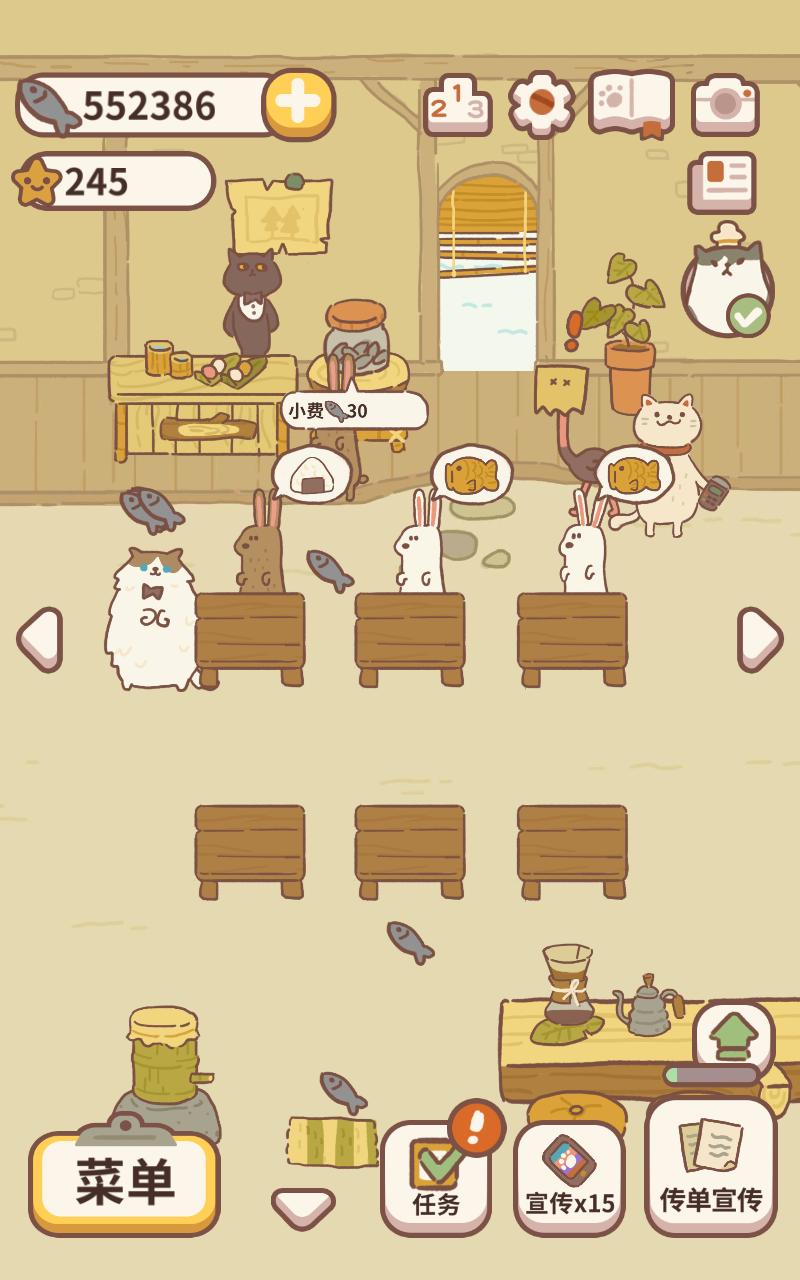 用获得的小鱼干和星星来购买餐厅设施,餐厅设施越多来的客人就会越多