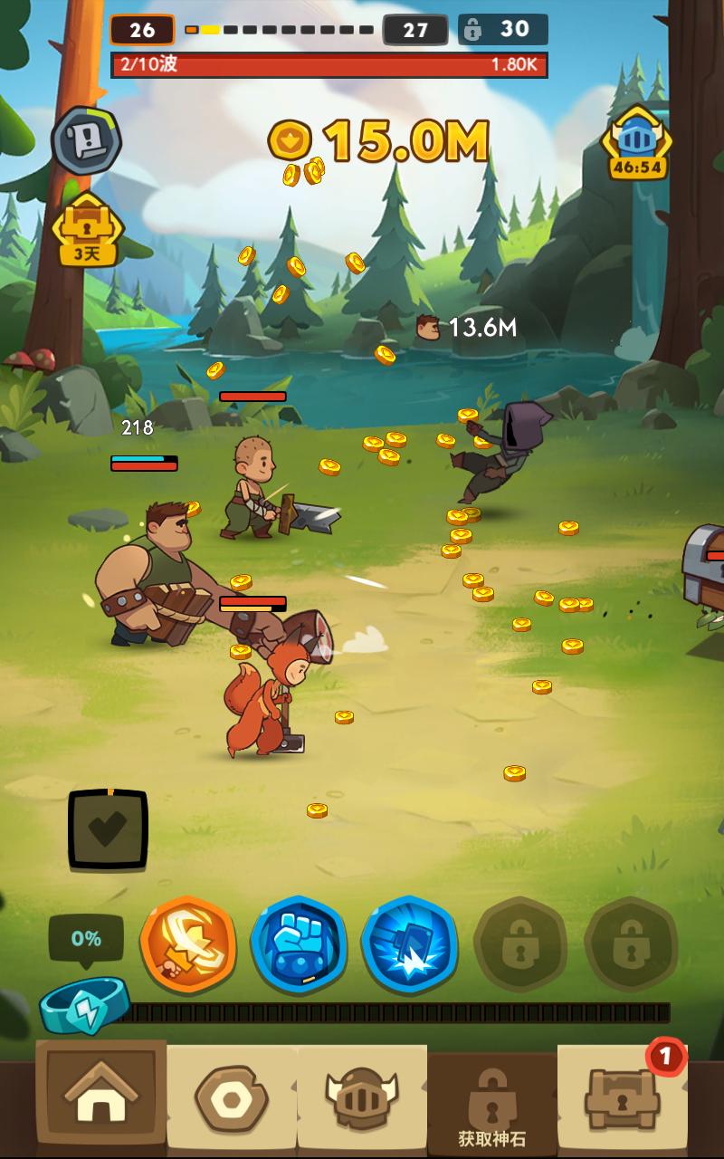 2、最初玩家通过点击屏幕击杀出现的敌人获取金币,这样就可以获取到第一个英雄人物,拥有英雄后他就会自动攻击,不过速度肯定比自己点屏幕要慢很多