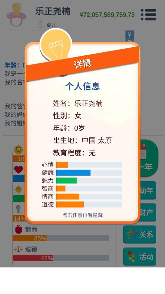 第二人生是一款轻度的模拟游戏,这款游戏中您将从一名小婴儿开始成长,游戏有很高的自由度,有很多事件会随机发生,您可以选择您的一生怎么过,不同事件的选择会影响到您以后的人生,您可以学习工作恋爱,此版本中有无限的金币,玩家在成长过程中不会出现没钱的现象;