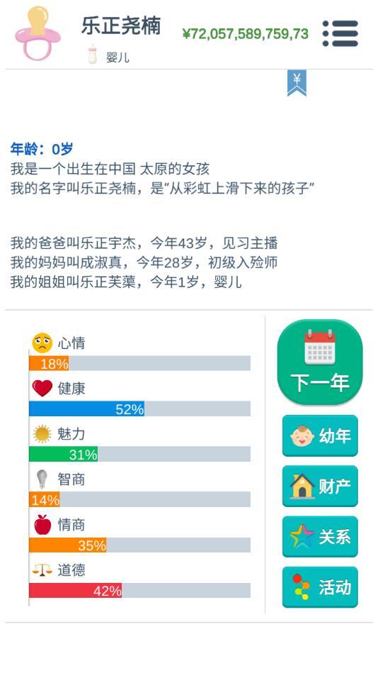 可以生儿育女,还会拥有孙子孙女,从婴儿开始,你的属性会随着各种事件而变化;