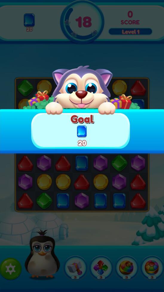 冰上冒险任务,一款拥有很多小动物的冒险消除游戏,游戏中有很可爱的小企鹅陪伴玩家一起完成你的消除任务,当游戏开始玩家就会知道你需要消除多少冰块了,如果没有办法消除还可以使用道具哦,快点来玩吧。