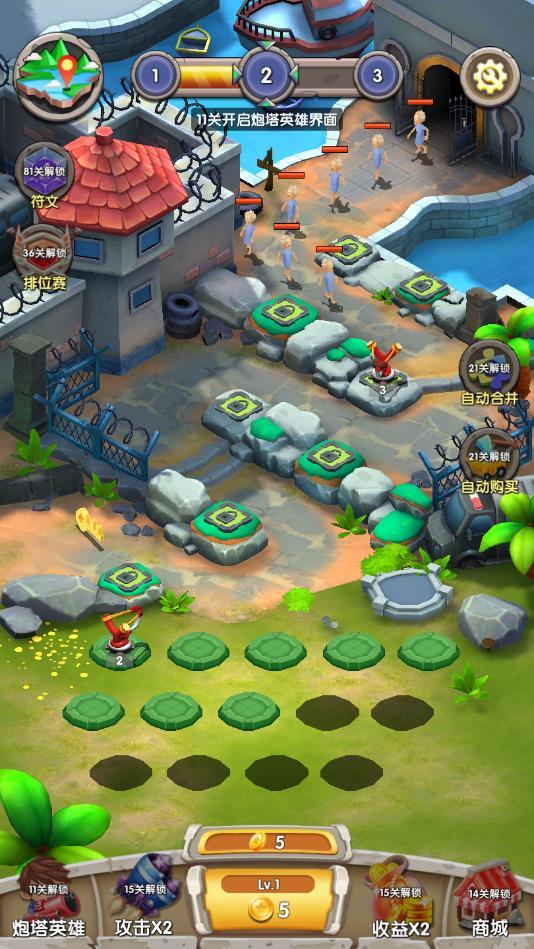 一个都别跑是个非常精彩有趣塔防闯关玩法,以合成的方式进行炮台的不断升级,等级越高的炮台,威力也就越大,非常庞大的世界地图关卡等你来闯,通过闯关的方式,进行更多地基的解锁,才能够安放更多的炮塔,进行塔防操作。
