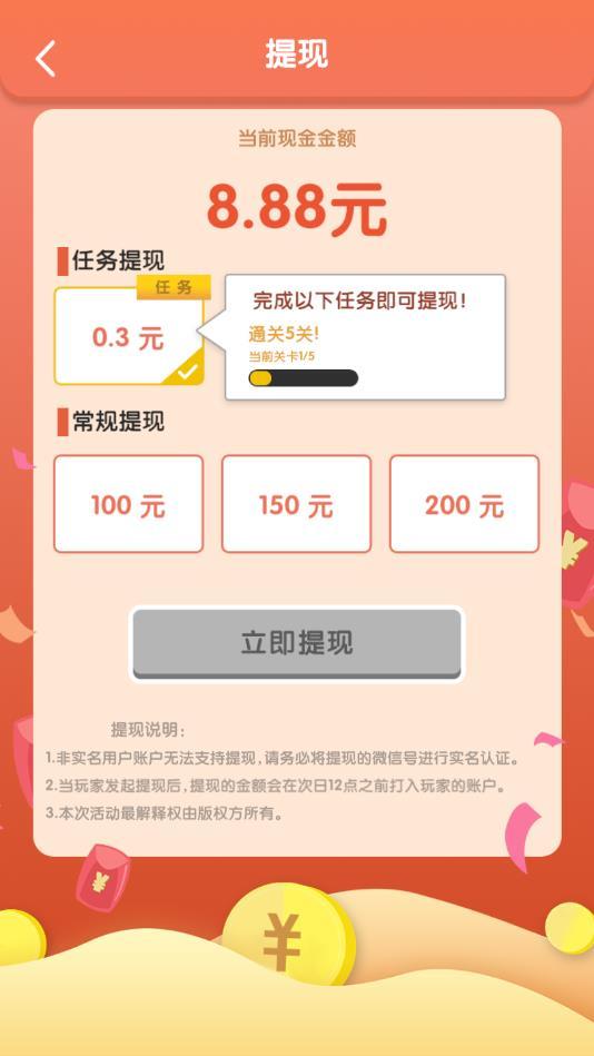 游戏玩法是非常有趣的,而且还可以获取红包收益,每次闯关成功都有机会获得红包,完成相应任务以及额度,就可以进行红包的提现操作。