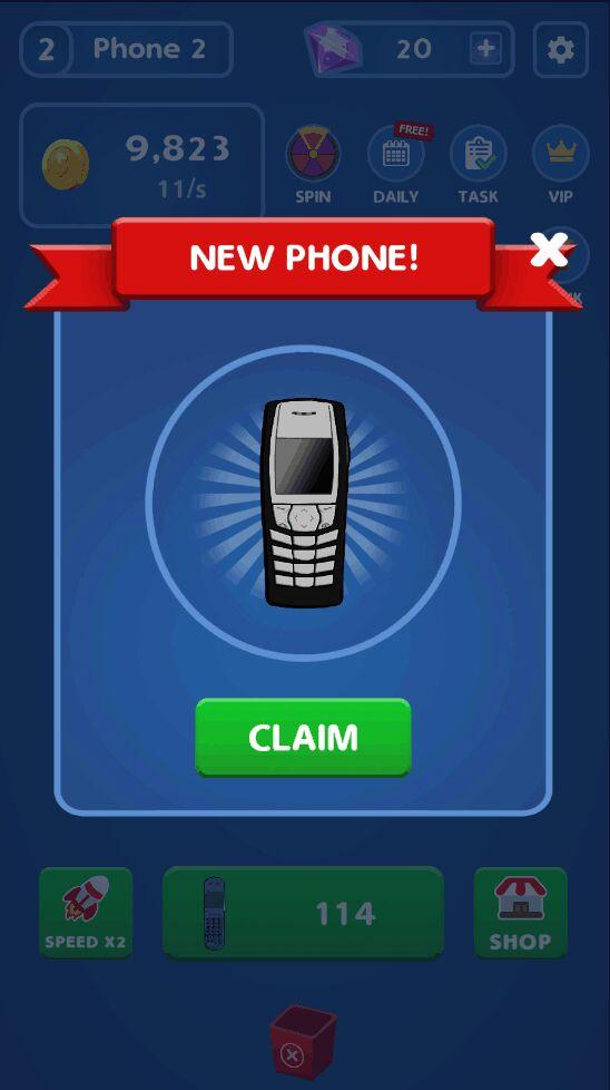手机收藏模拟器,进入游戏后玩家可以看到界面中央立着很多格子,下面是一个手机,点击这个手机上面就会出现手机,然后玩家将两个相同的手机进行合成,玩家通过不断的合成就可以得到一个非常棒的高端机。