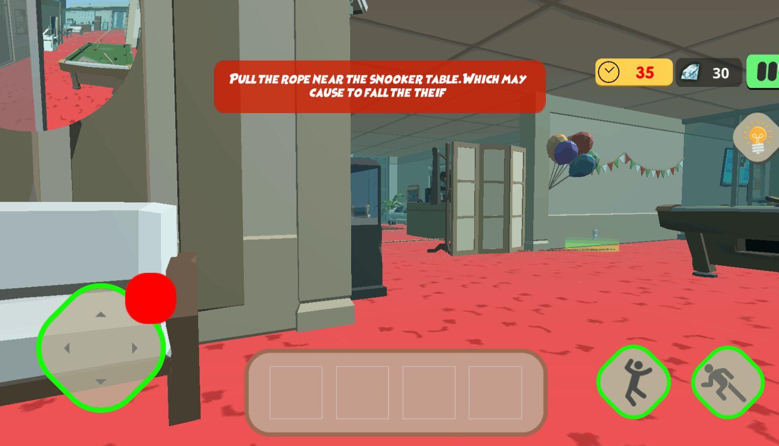 小偷恶作剧大师,这是一款带着紧张元素的游戏,玩家需要在房间里偷一个东西,同时不能够被主人发现,而玩家为了能够快速的获得这件物品需要时刻关卡地图,这样才能够避开主人,而不被对方抓到导致玩家游戏失败。