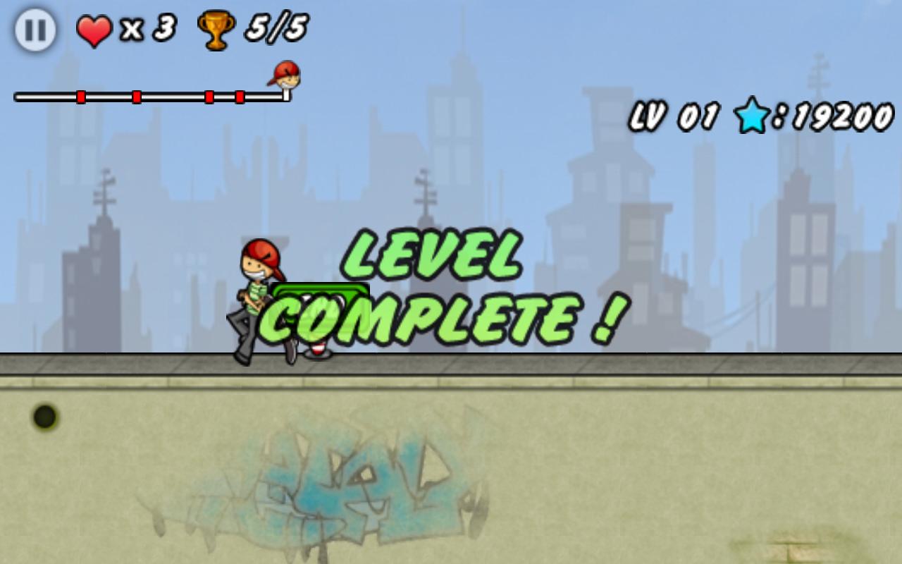 游戏的目的只有一个,操作我们的滑板少年越过层层的障碍物,最终抵达最右边的终点。游戏的操作也非常容易,向前加速,向上跳跃,虽然简单但却考验玩家的反应能力,随时冒出的阶梯、野猪、巫婆等考验玩家的神经,一不留神,画面中的少年可能就人仰马翻。