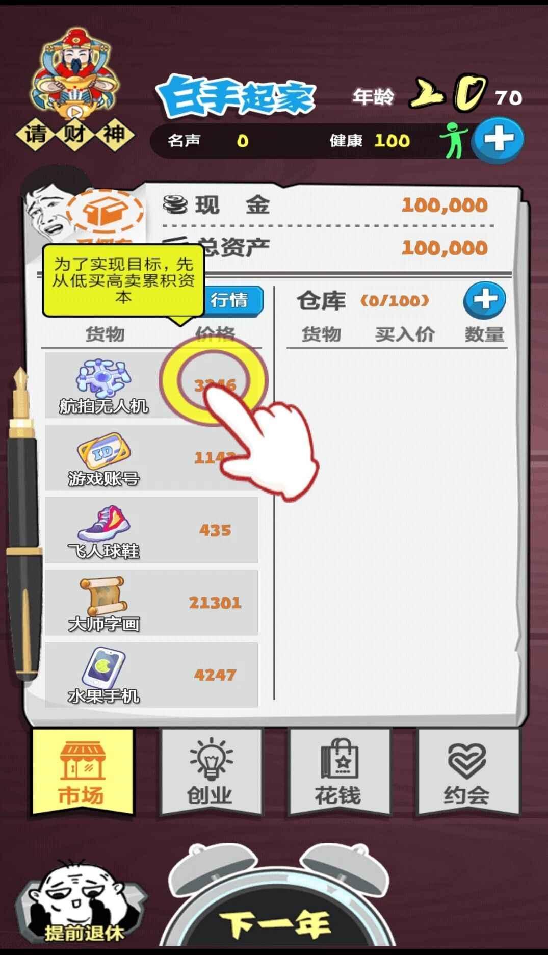 一开始还是需要花一点钱来购买需要的物资,等买的好的时候就能大量进货用钱生钱扩大资本。