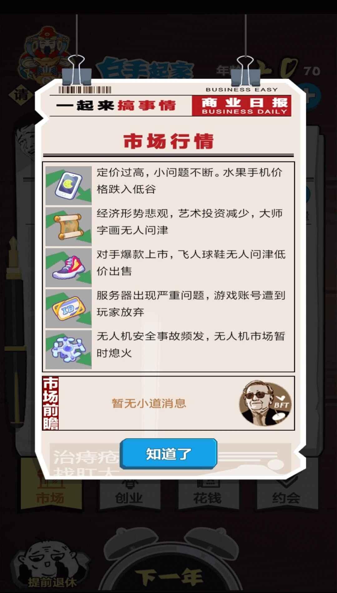 老友大作战是一款非常简单的养成经营类游戏,在这款破解的版本中玩家将能够看到大量的天赋点,天赋点能用来点家族天赋,你的天赋越高,你经商的收益就能够越高,这些天赋的用处还是相当大的,游戏中你的目标就是在70岁之前积累一定的财富,为此你将会尝试多种经营的玩法,你能够炒币,能够开公司,能倒卖鞋子等等,只要能够赚钱你都应该去尝试一下。