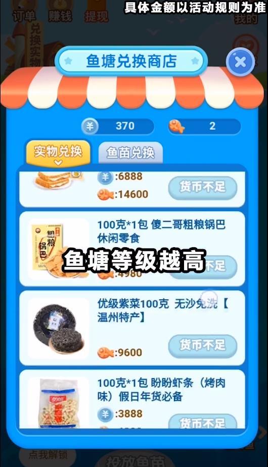 软件钓鱼之后可以养鱼,不断的升级你的鱼塘,而且还可以用金币换零食包邮哦。