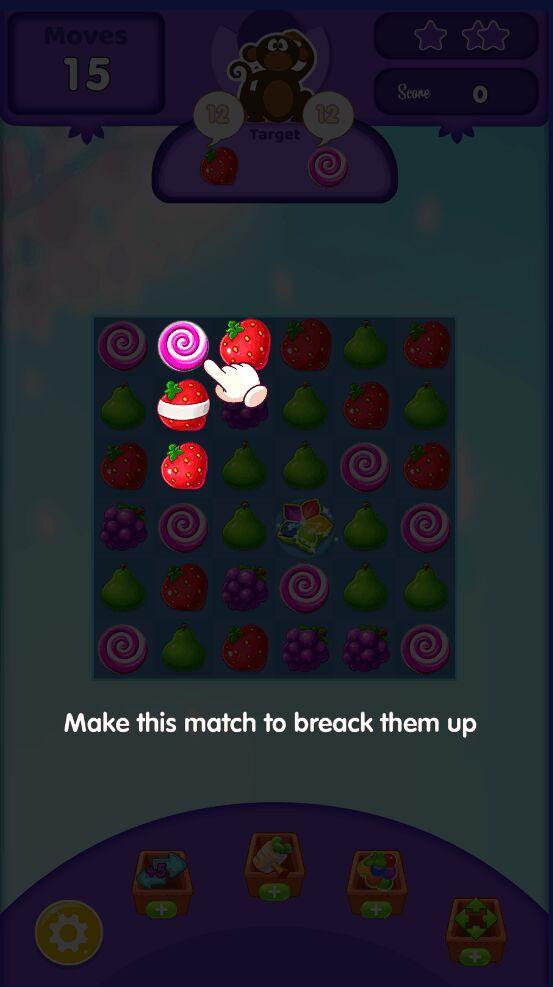 您将看到糖果和水果的组合,虽然易于玩,但您通过将一个糖果和水果拼图相继组合而解决。