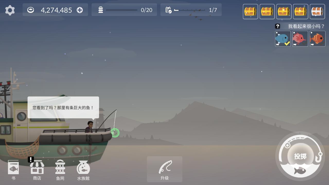 清爽简约的游戏画面,轻快的背景音乐,钓鱼人生制作十分精致,给玩家带来十分之轻松愉悦的游戏体验。游戏过程中,玩家需要控制角色在大海中进行垂钓,钓上来的各种珍稀鱼类还能加入水族馆为玩家不断的带来更多的收益。游戏的操作相当的简单,玩起来也轻松有趣,对这种玩法感兴趣的小伙伴赶紧下载游戏来体验吧。