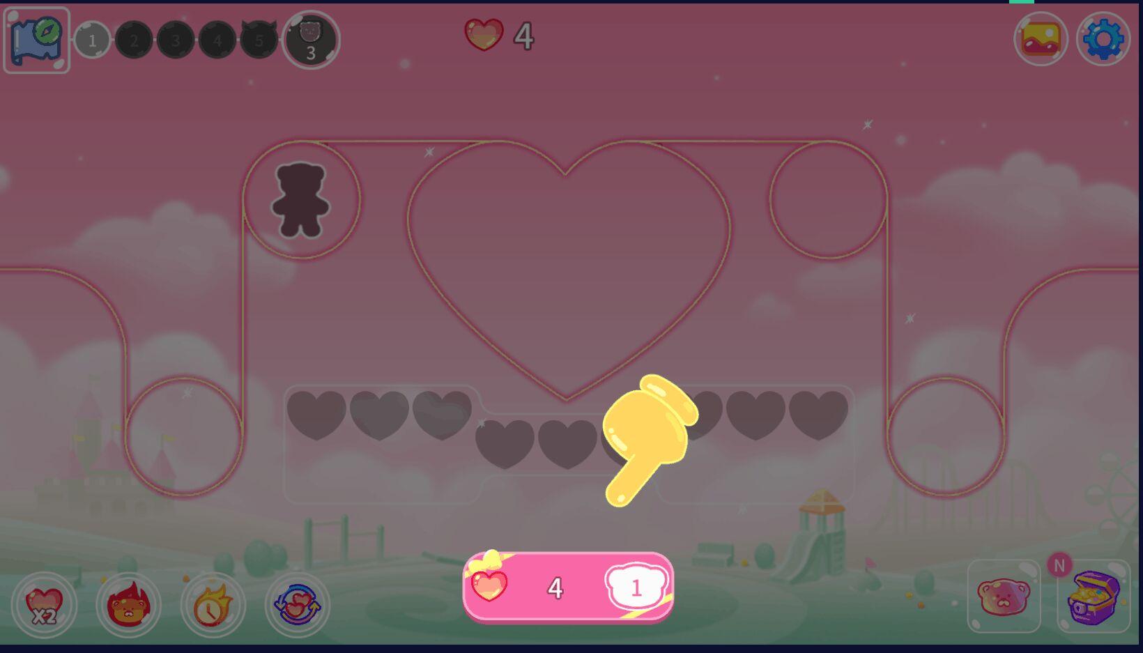 小熊防御,整个游戏的画风看着真的是又卡通又梦幻,玩家需要完成的任务就是将出现的小心心全部给清除掉,玩家可以看到整个舞台都是线性的,那些小心心就顺着线条来入侵整个舞台,玩家则需要清楚舞台上的其他物品。