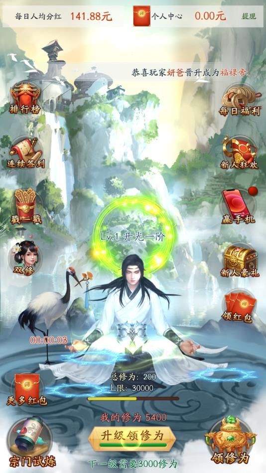 游戏玩法是非常休闲的,让你睡觉也可以进行放置修炼,还可以进行宗门历练,让你能够更加快速的进行修为升级以及红包的获取。