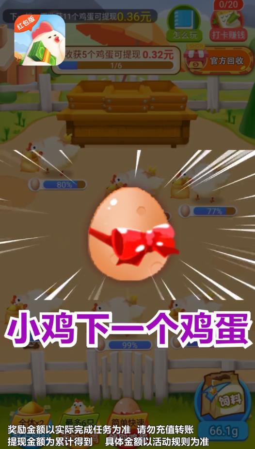 一起来养鸡游戏玩法是非常休闲且轻松的,轻松就可进行多只小鸡的养成,解锁更多的农作物,让小鸡的食物更加丰盛,游戏玩法是非常解压的,而且在这里养鸡还可以赚钱,游戏操作也是非常简单,轻松领取超多红包奖励。