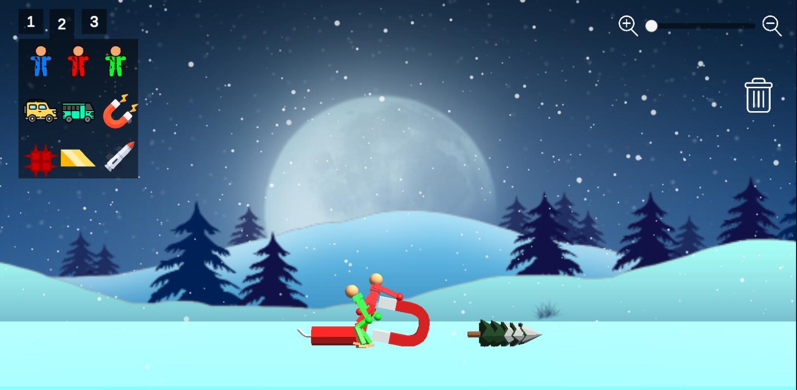 圣诞老人沙盒模拟,游戏中有很多的物品,玩家从格子里将物品拖出来,会看到不同的物品组合在一起发生的奇妙现象,如果将磁石拖下来,那所有的物品都会被吸到磁石附近,如果将火箭拖下来,除了磁石人也会被炸。