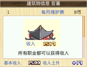 设施类建筑指的是城市的基础设施与大型娱乐设施,属性和效果与生活类设施基本相同。不同的是设施类建筑包含“官署”,游戏中只能建造三座官署,且官署建立后无法拆除,所以以三座官署为核心的城市布局要在游戏一开始就心中有数。建立官署后市民们将可以转职,且全部市民都可以在官署获得较多的收入。
