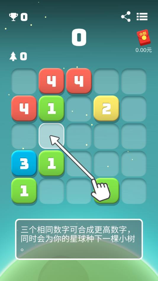 非常简洁的游戏画面,非常易懂的游戏规则,让你轻松上手进行合成操作,合成越多,你种植的树木也就越多,还可以获得红包奖励,得到一定门槛就可以进行提现操作。