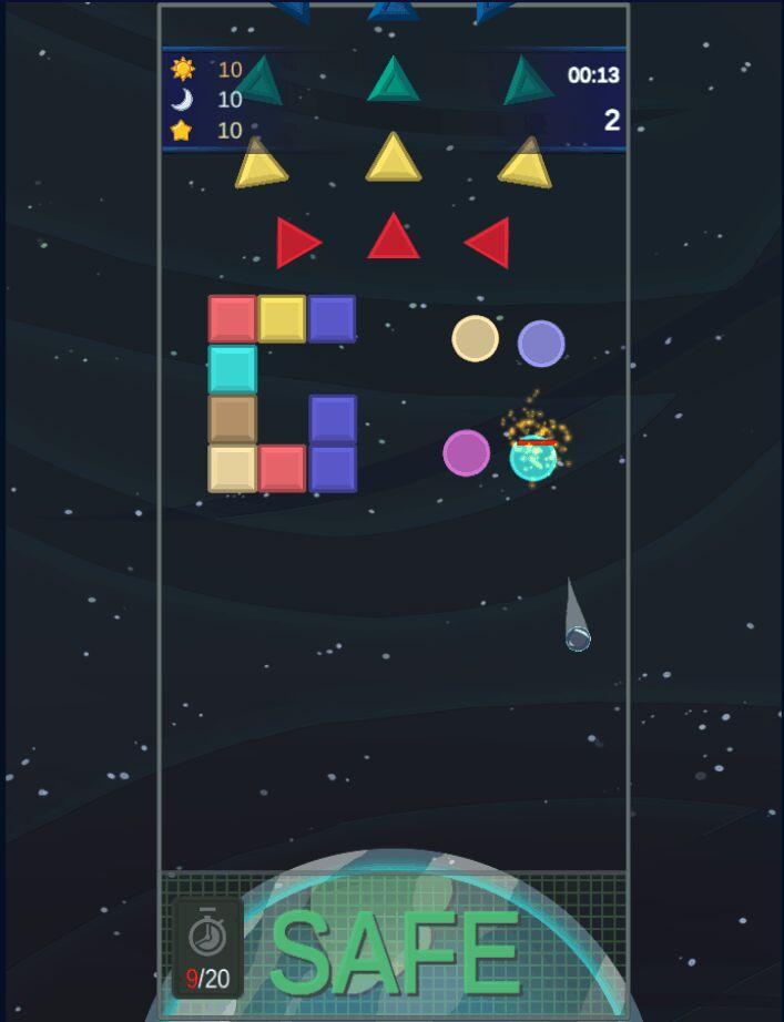 次世代弹球,进入游戏玩家可以看到上面不断的有各种形状的物体掉落,玩家则需要在下面发射小球,当小球碰撞物体数次时就会让物体消失,这对于小球弹射的角度还是有一点要求的,而且游戏的难度也会逐渐增加,玩家能够成功吗?