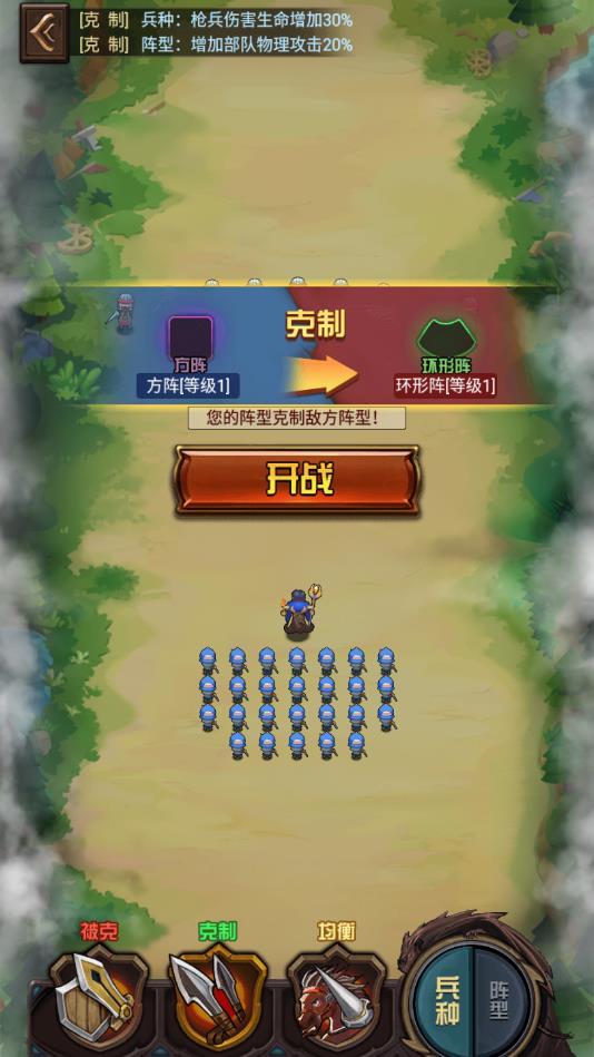 游戏中士兵的种类是多样,并且相互之间是克制的,盾克弓、弓克枪、枪克骑、骑克盾,合理进行士兵的派遣,能够起到意向不到的效果。