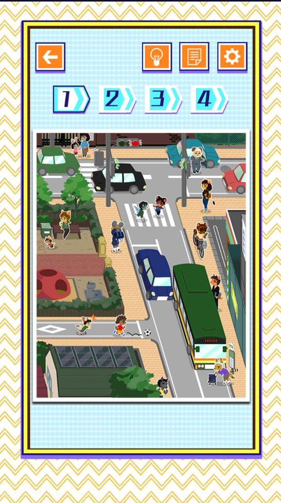 有惊无险的事故,进入游戏后玩家可以看到这是一个十字路口,车来车往的,还有很多的行人过马路,甚至有很多的孩子在马路上玩耍的很愉快,这是非常危险的事情,玩家需要找到这个场景中的错误景象,然后顺利的通关,获得游戏的胜利。