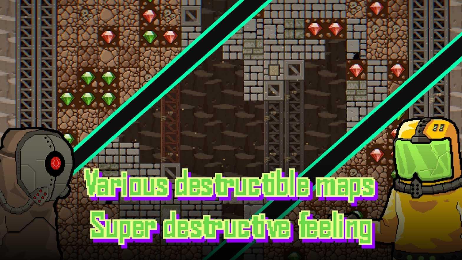 在未来的世界中并没有什么具有强烈光污染的高科技城市,世界在经历一场战争之后地面的世界遭到了毁灭性的打击,剩下来的人类不得不深入地下生存,在地下有着非常多的未知的事物,你需要使用你手中的炸弹来应对这些恐怖的生物的同时尽可能地往下前进,这将是一次非常有趣的挑战,在这废土的世界之中,你就是唯一的朋克。