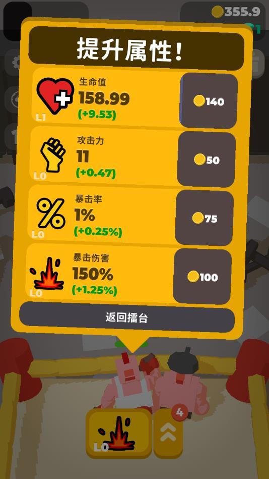 不断进行拳击战斗,获得更多的金币,进行多样属性的提升。