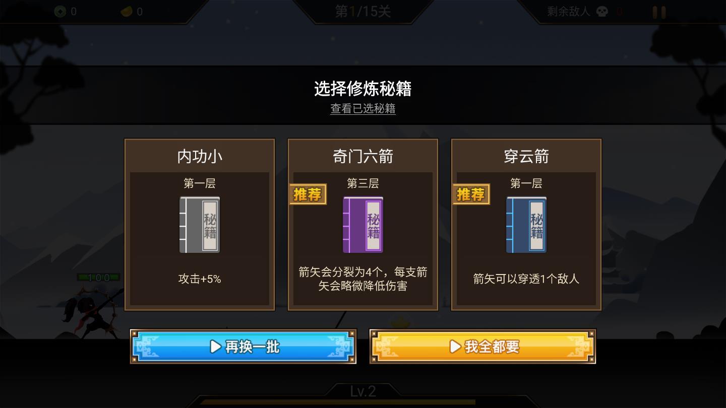 每次闯关成功都可以在丧不同类型的修炼秘籍中,选择一个你需要 的秘籍,进行学习。