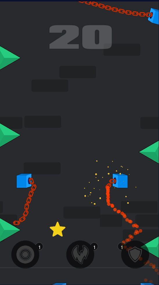 打破绳索,游戏开始玩就可以看到你的前面有很多的锁链,旁边也有很多的尖刺,玩家的任务就是控制着脆弱的小球躲避锁链和尖刺,因为会有一个三角形在前方开路,所以玩家也不用太担心,但是当三角形破开绳索,断的绳索也有可能掉到小球身上。