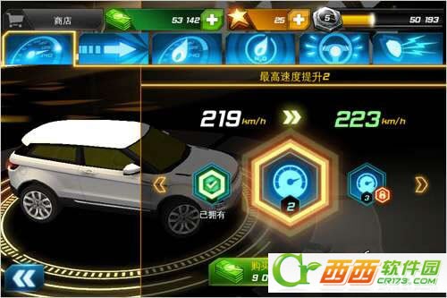 在商店里,我们可以改装自己的爱车。首先我们先要升级发动机,不过发动机的解锁也是根据星星的数量来解锁的。