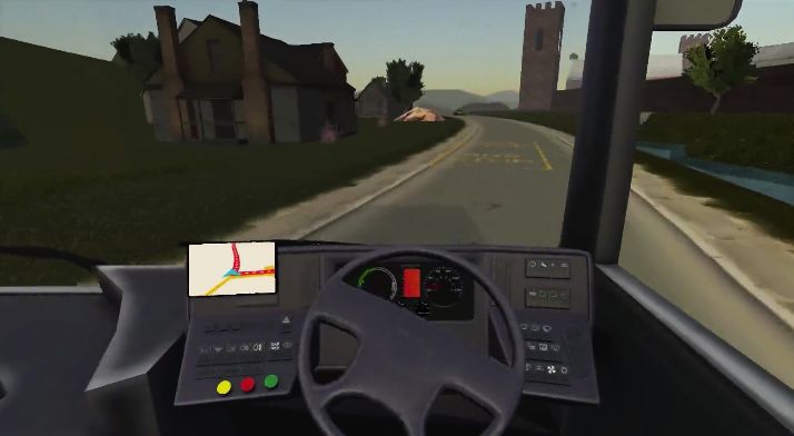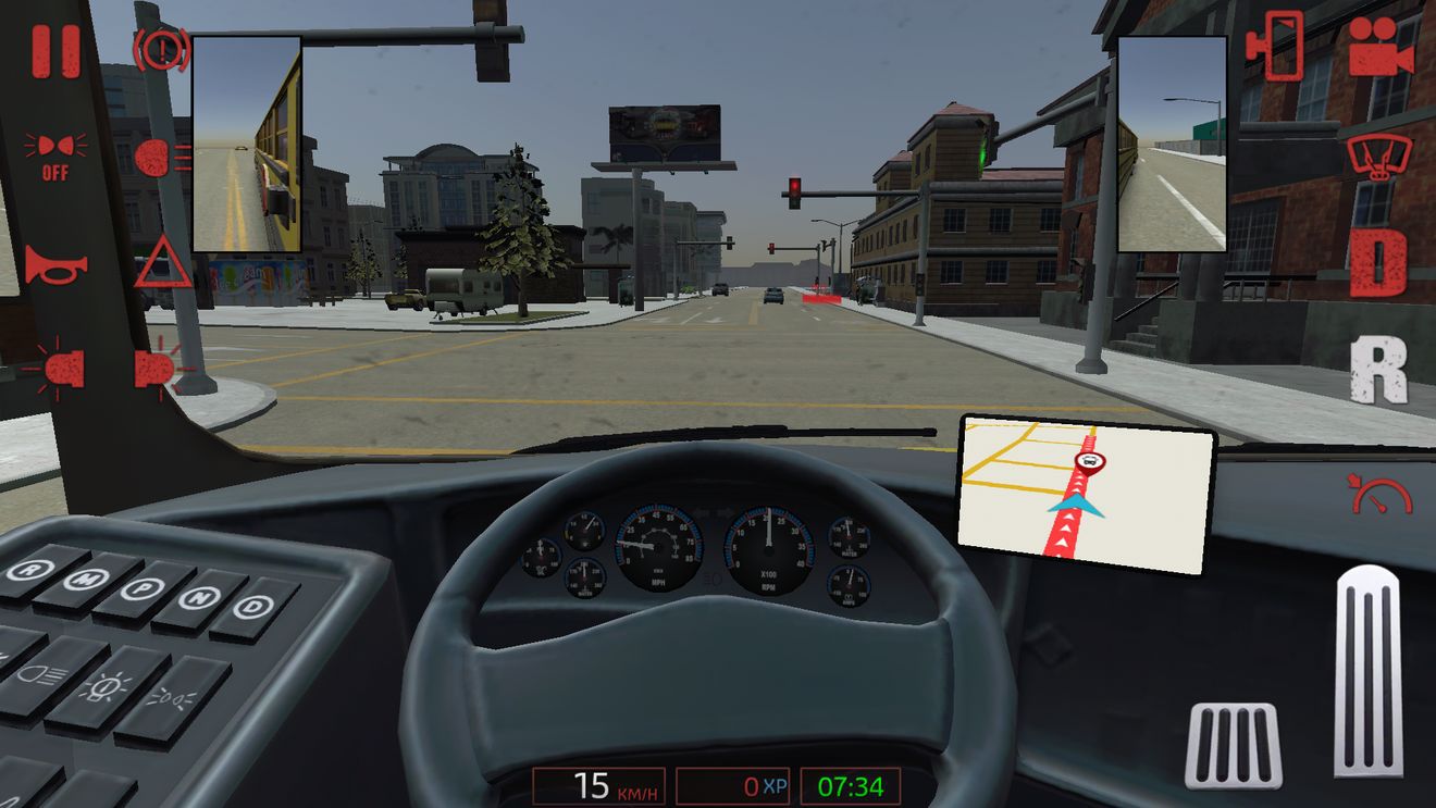 游戏有多种操控模式,可以选择自动或手动挡。新玩家当然建议从自动挡开始体验。驾驶舱内的导航系统会清晰地告诉你路线。看到路边红色区域便是车站,到站后会自动出现开/关车门的按钮,以便接送乘客。