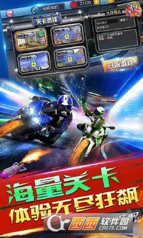 《侠盗狂野摩托飞车》是一款赛车竞速类游戏,但不仅仅是一款竞速游戏,还融入了格斗玩法,形成了新式的格斗竞速游戏。游戏中有生存模式,竞速模式,障碍模式供玩家自由选择,还有大量的炫酷摩托,拉风武器供玩家自由使用,让玩家获得速度与战斗的酷爽体验。游戏内有4款摩托供玩家选择使用:长岭战豹,蓝宝龙300,川崎忍者,哈雷蓝鸟,款款都是精品,外观炫酷,属性强大。摩托还能在玩家使用中成长,属性变得更加强大。格斗竞速当然少不了武器,在游戏武器店内有多种炫酷武器出售,帅气的店家会免费赠送一件武器哦。让我们骑上摩托,拿起武器,击垮赛道上的敌人,最终的胜利只属于我们。