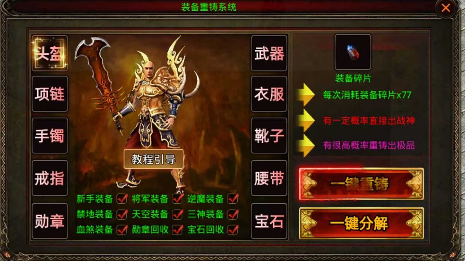 3.装备回收碎片,碎片可重铸极品装备,可以升级盾牌,可强化装备极品。