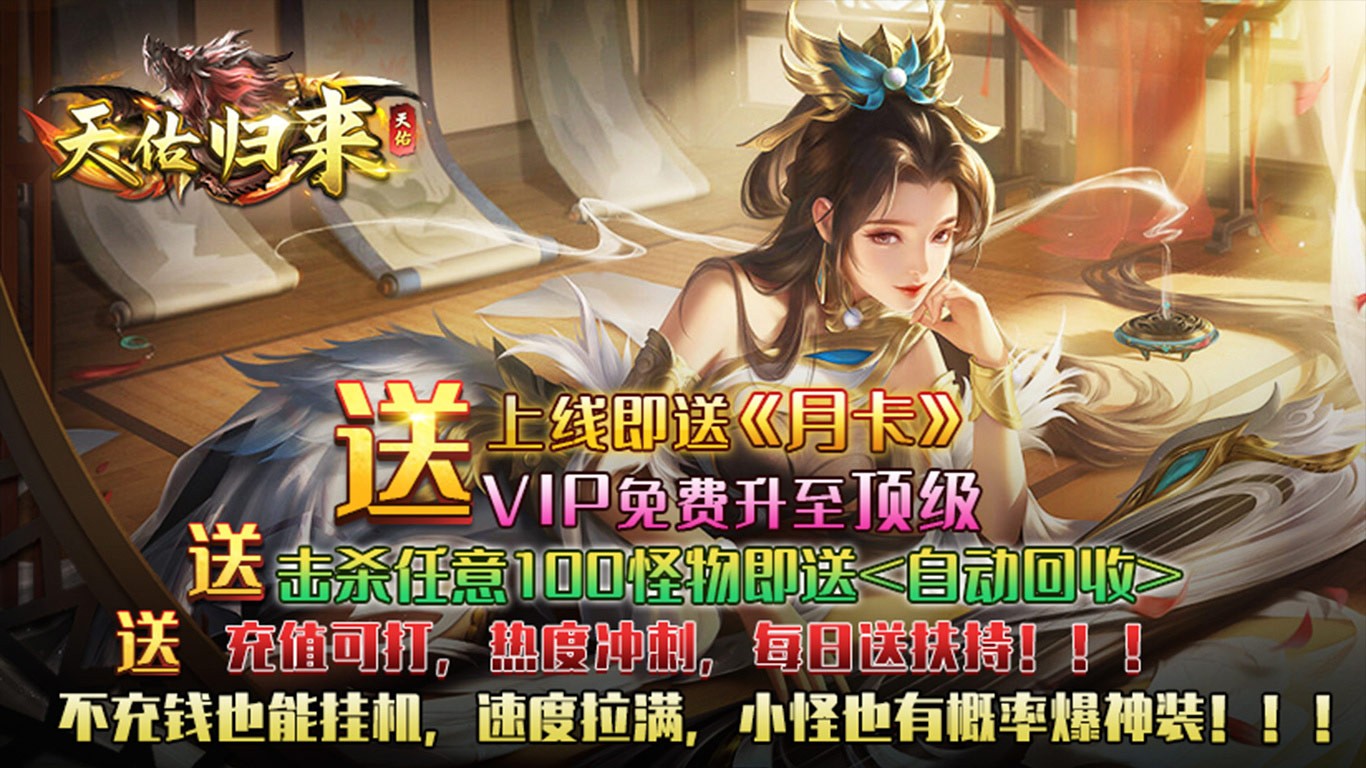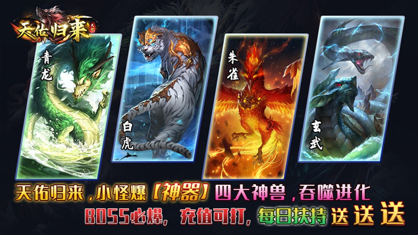 1.天佑归来是一款集合,异兽吞噬,小怪爆红装,主角成长等为一体的传奇。